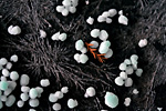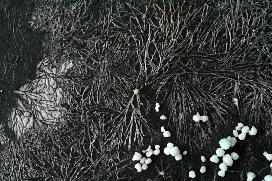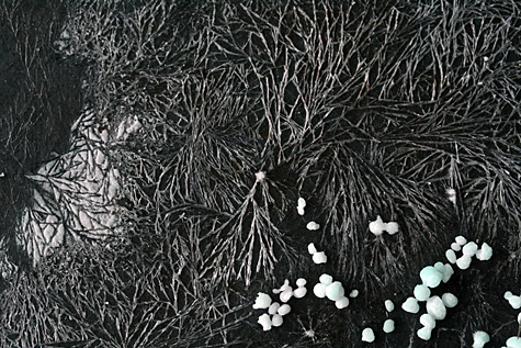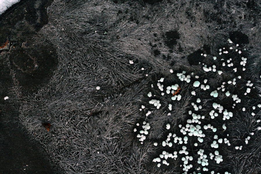 on the flagstone of the front steps. i wonder if they have anything to do with the dog-safe ice removal pellets sprinkled along the walkway. they resembled tree branches or plant roots. i went out 3 separate times to take photos of the unique frost patterns.