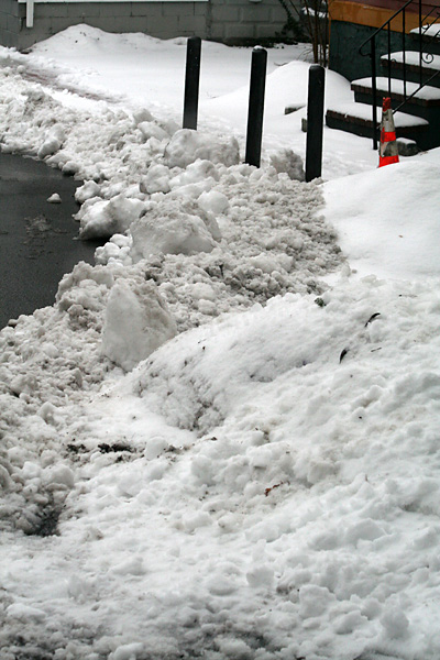 despite the silence, i knew there was a snowy landscape waiting for me outside. it'd already started to snow yesterday beginning at midnight. i got dressed as soon as i woke up and went out to shovel. there was only 2" of snow on the sidewalk, but it was the wet and heavy kind and took longer than usual to clean up. the only good thing was the snow was like cement and i could stack it up high. i went out again an hour later to clear half an inch of new sleet that'd fallen. by noontime the storm was over but the sky remained grey for the rest of the day.