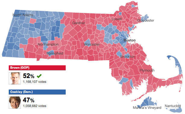 in the end, martha coakley lost the senate race. out of about 2.2 million massachusetts residents who voted today, scott brown only won by 100,000. a victory nonetheless, and a pretty substantial one given that a month ago nobody even knew who he was and everyone thought coakley would coast to an easy win. however, the win isn't a republican mandate; it's not like massachusetts never vote republican before (witness our slew of republican governors like weld and romney). brown was also helped by his own personal charisma pitted against a weak democratic opponent who had trouble connecting with common folks and mistakenly assumed she'd win in this abbreviated special election campaign schedule. coakley did do extremely well in the greater boston area, winning with lopsided margins (cambridge voted overwhelmingly for coakley at 84%). but further out in the suburbs they preferred the brown. how will democratic senator kerry get along with new republican senator brown? will they be frenemies? the good thing is the brown senate seat is only until 2012; democrats will have another chance to regain it soon. however, what this means nationally in terms of spoiling the democratic agenda is yet to determined.