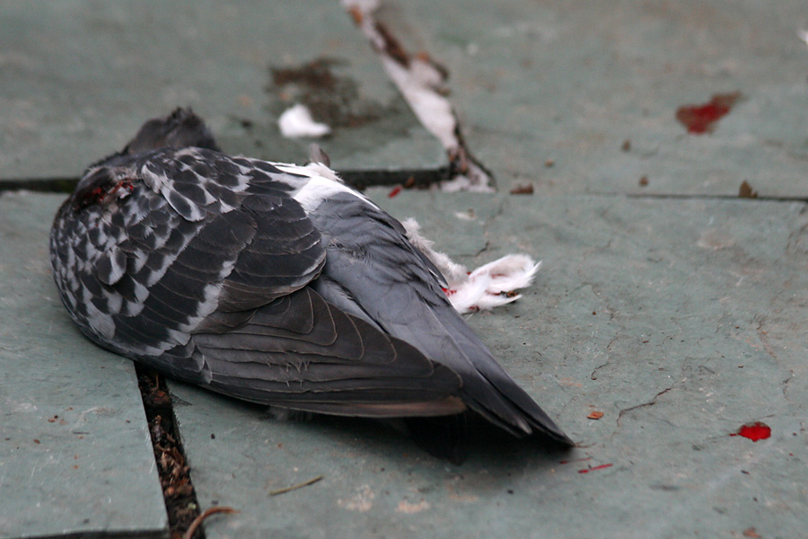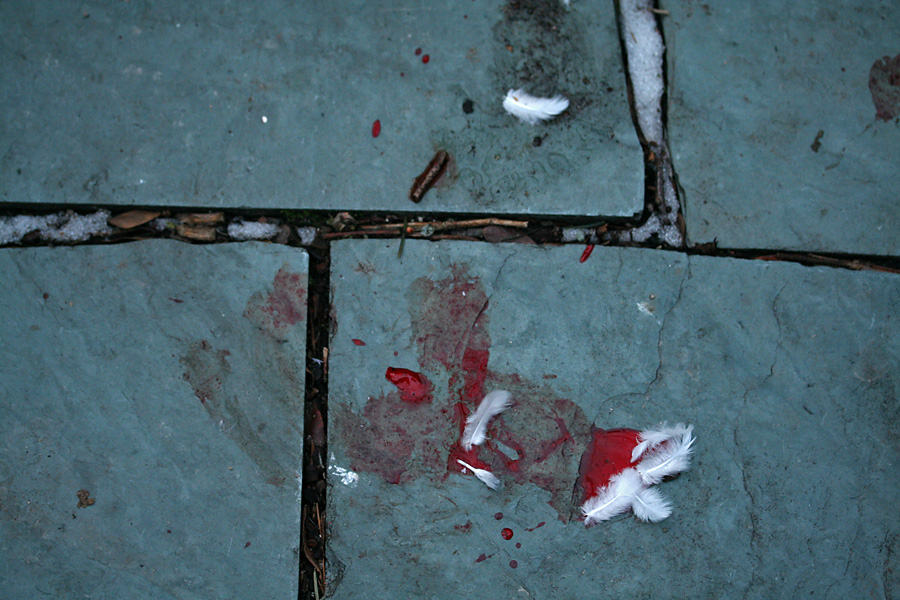 back at home, i was afraid to go into the backyard and see what i'd find. the pigeon was gone. not only that, but the hawk must've decided to eat elsewhere because the backyard was free of pigeon parts. all that remained was a pool of blood and a few feathers.