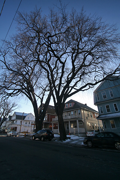 getting to medford square was just half the adventure; returning home was the other half. there was no way to avoid the hills and the ride back felt even steeper. i stopped to take some photos of some rather large trees on main street between bowdoin and wellesley street. it's the exact same kind of tree i saw on rc kelley street in cambridge, except these were just tall instead of wide and tall. i still don't know what kind of trees these are. i guess i'll find out once the leaves come back.