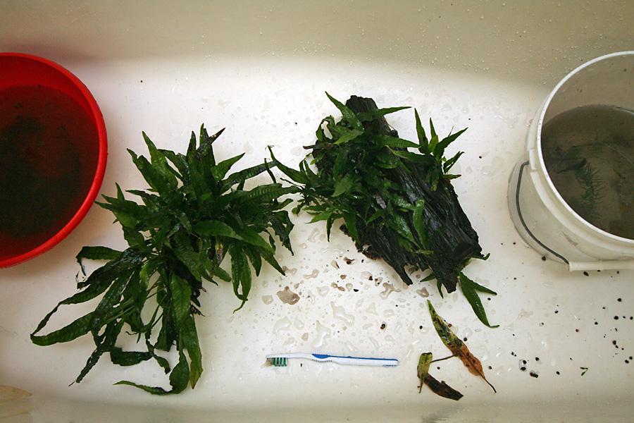 it's been a month since i last cleaned out the aquariums. i managed to take another fish census: 6 female guppies, 3 glowlight tetras, and 1 cherry barb. i did a more thorough cleaning this time around, which meant replacing the activated carbon filters and taking everything out and giving them a good scrubbing.