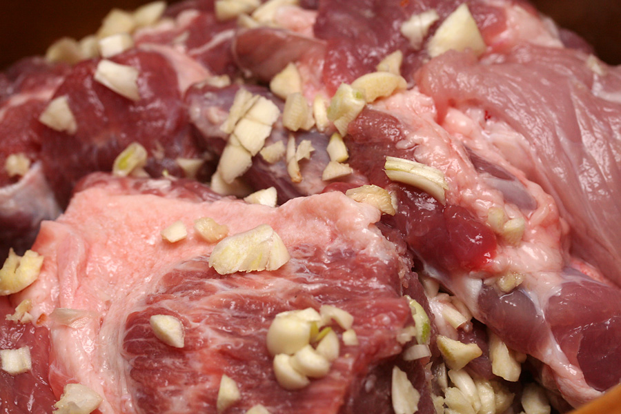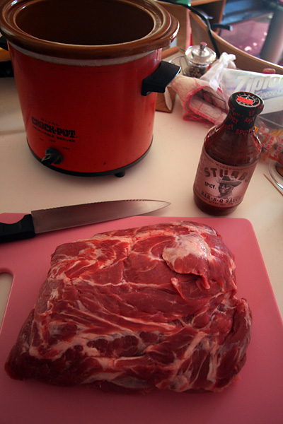 later i went to market basket to pick up some ingredients for making pulled pork (partially inspired by what my sister made last night). i bought 5 lbs. of pork butts for $8.50 along with a bottle of special spicy BBQ sauce. i found a bunch of slow cooker pulled pork recipes online, but in the end i just went with the simplest recipe. i basically cut the pork butts in half so it'll fit inside my crock pot. i cooked everything on high, and added some chopped garlic and about a cup of chinese rice wine. the wine was a suggestion from my mother, who said it'd mask the unpleasant pork smell during cooking.