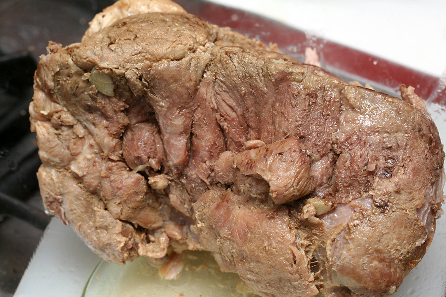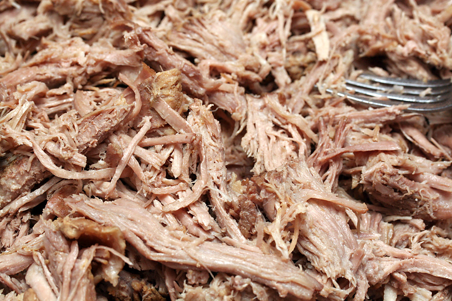i started slow cooking at 2:00 and didn't get to eat until well after 10:00. around 8:00 i took out the pork butts and shredded (pulled) it with some forks.