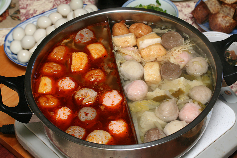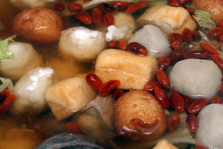 because there was so many people (8 total), we went with 2 hot pots, each on its own electric induction cooker. i sat by the end of the table that had the traditional dual hot pot. i like my hot pot spicy and kept on adding spoonfuls of spicy chongqing hot pot paste. basically, every time the broth started to become clear, i'd add another spoonful or two, much to the chagrin of some of the guests who thought it'd be too spicy and salty (spicy, no, salty, yes, but you basically don't want to drink the leftover spicy broth anyway). at the other end, my sister - who doesn't eat spicy - had a clear broth filled with some traditional chinese medicine spices, like goji berries.