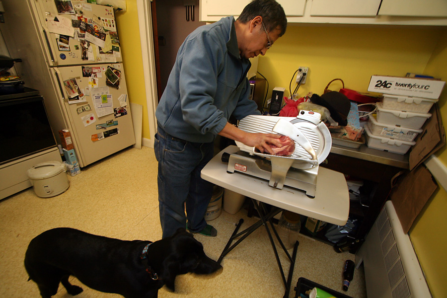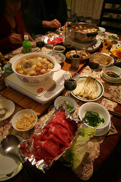 the nearest hot pot was actually too far away for me so i ate standing up the whole time (i don't think anyone noticed, since everyone was too busy eating). rarely do we have this many people over for hot pot, which can present unintended problems as people unsuspectingly compete for food. hot pot is like the darwinian natural selection of eating, where if you're too slow, then that piece of meat you had cooking might be snatched away by somebody else.