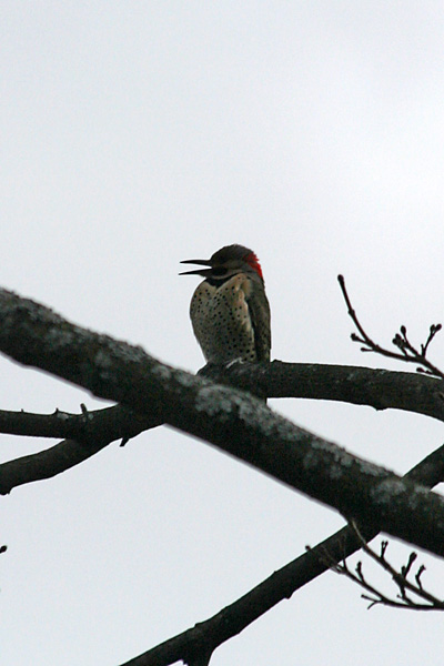 flickers are beautiful birds: striped back, polka-dotted belly, black bid, red triangle on the nape, and males have moustaches. and when they're in flight, they have a yellow underwing. i've seen them before a couple of times at the mt.auburn cemetery.