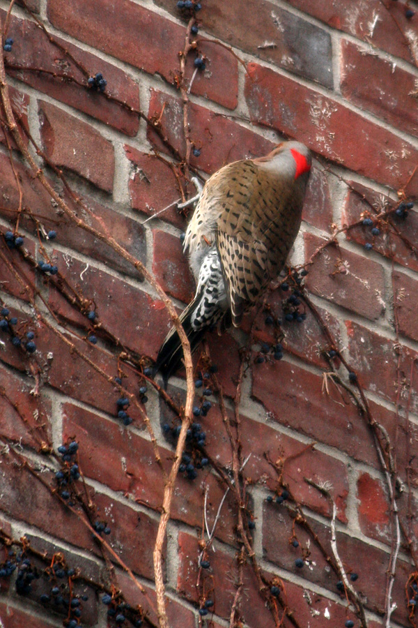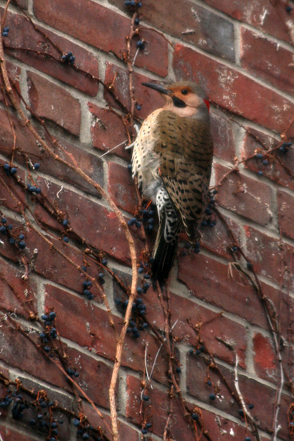on my way to belmont, behind the harvard-smithsonian center for astrophysics building on manassas street in cambridge, i heard a distinctive bird call high up in a tree. at first i figured it was just a mockingbird, but the call was strangely unfamiliar (a repeating kyeer call). i stopped the bike and saw the silhouette perched on a tree branch. from what little i could make out, there was enough color to know it wasn't a mockingbird. a cedar waxwing? as i quickly pulled out my camera and changed the lens for a telephoto shoot. the view from the eyepiece told me it was a northern flicker, a species of ground-feeding woodpeckers. i snapped off a few dozen shots before the bird flew away. i followed it to wear it flew off, hoping maybe i could get a clearer look. i looked up on the brick building saw it clinging to the side of the wall. i snapped another dozen photos.