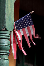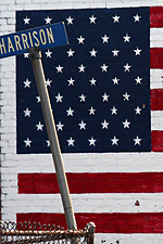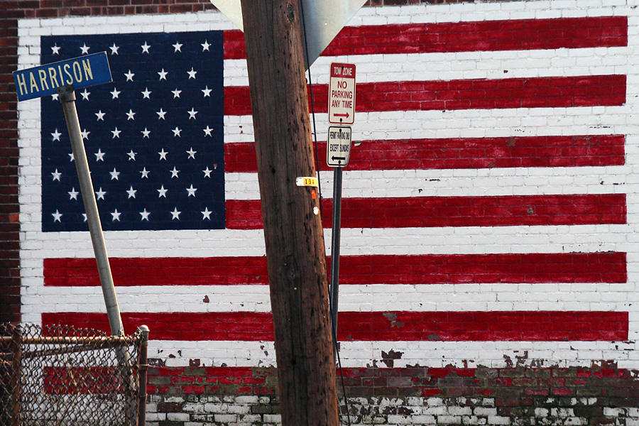 returning home via one of my many shortcuts, i snapped some photos on harrison street in somerville (the road that sort of runs behind the star market). there's a tibetan maypole (apparently the house of a traditional tibetan doctor), a seemingly abandoned house with boarded up doors and windows flying a tattered american flag, and another large american flag mural nearby. i almost didn't notice a young man was sitting outside his porch smoking. i raised my camera to take a photo of the tattered flag. he told me i could throw a rock through the window to get a better action shot.