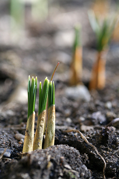 in my parents' backyard some of the bulbs i planted have sprouted. they've been out since the start of february, but they've been growing slowly. the crocuses are the easiest to identify with their tight bundle of leaves. some other plants that i thought were crocuses turned out to be alliums (onions). they were actually the ones that began to sprout in early december 2009 when we had that stretch of unusually warm weather. hope this doesn't somehow stunt their growth for the oncoming spring.