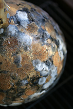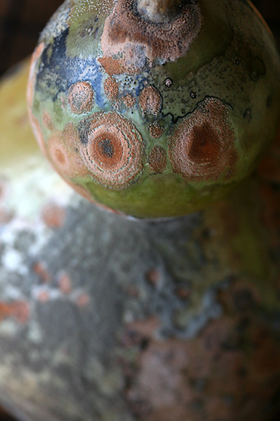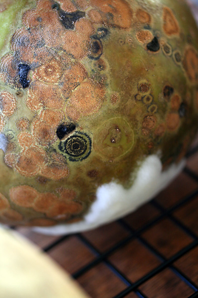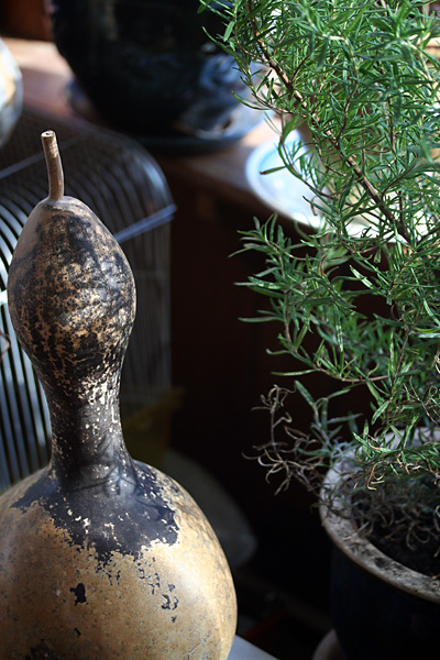 worried about the amount of mold growing on my drying bottle gourds, i went online to do some research on cleaning them off. apparently mold is a good thing, because it means the moisture is being wicked out of the gourds. some of the gourds are very light - meaning that they're pretty much dried - while a few are still heavy - there's still a lot of drying left to be done.