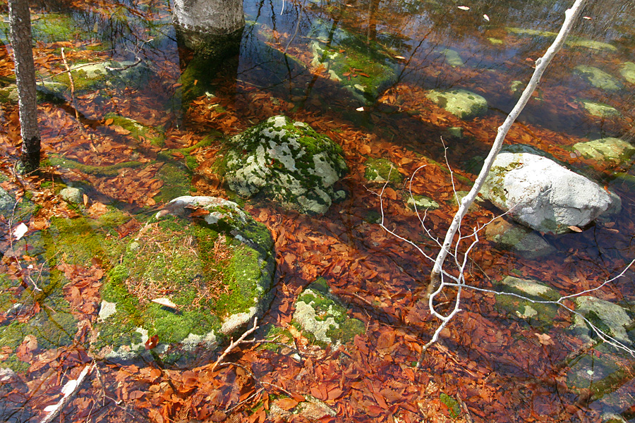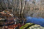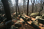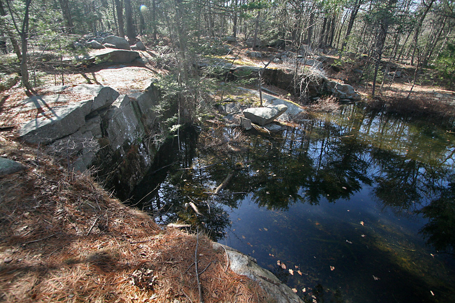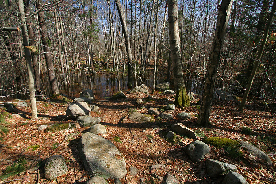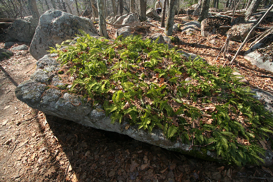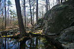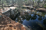 the trails from the quarry back to the main entrance is particularly rocky, strewn with large moss-covered granite boulders. further down were several vernal pools, recognizable by the haunting chorus of spring peepers. it's sort of eerie because you can't see them but when you get close enough to the pond, suddenly they all stop calling.