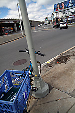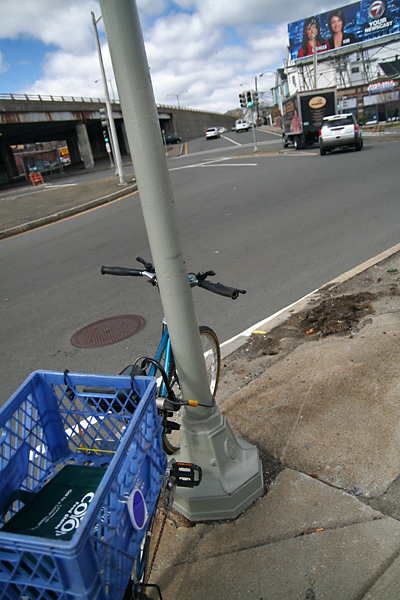 instead of navigating the 5-spoke-hub of union square, i pedaled up columbus avenue to go around that whole mess. along the way i spotted a blooming pussy tree and took some photos. coming down bow street, a police car and an ambulance had temporarily stopped traffic in order to tend to a person sitting on the sidewalk. this is where a bicycle comes in handy. i easily rode through the congestion, weaving from street to sidewalk to street. couldn't do that on the motorcycle! (not legally anyway.)