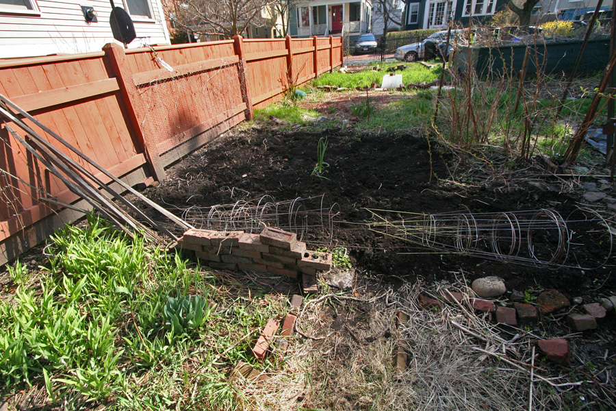 i was relieved to be back at home without incident. for my next adventure, i loaded up the back of my bicycle with a 25 lbs. bag of manure that i had in my backyard. with my bike wobbling from side to side, i slowly made my way down to the community garden a few blocks away. wearing my newly purchased gloves, i weeded my plot then tilled the manure into the soil. my little piece of garden space always seems so large at the start of spring, but will start to shrink once summer rolls along.