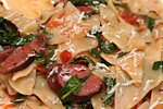my sister made dinner, some kind of pasta that looked like wonton skins along with some sausages.