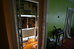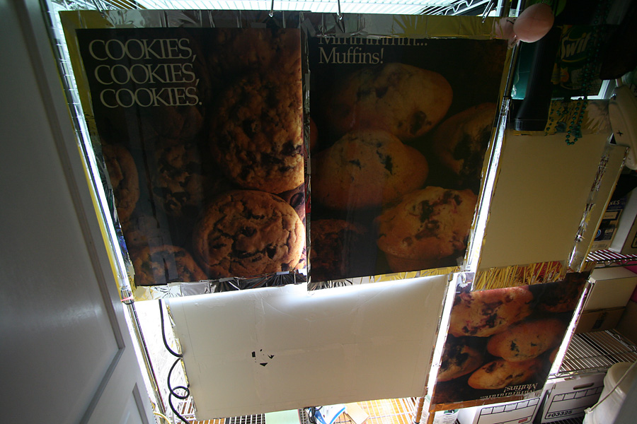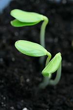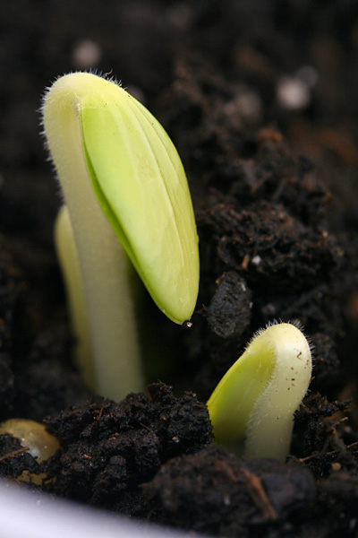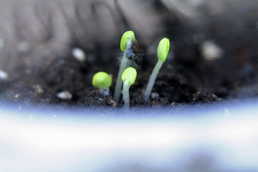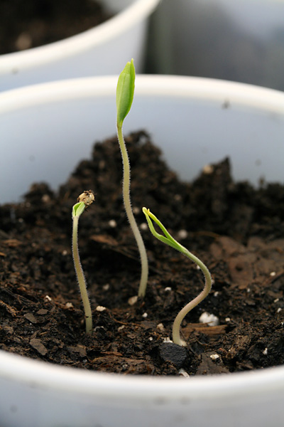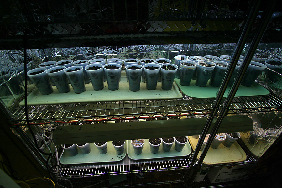 if i'd checked my records, i would've known that my vegetable seeds would sprout in a week (last year: planting then sprouting). nevertheless i was still surprised when i went to go check my containers today and saw a whole bunch of seedlings that i didn't see yesterday. i quickly moved them to the artificially-lit environment of my grow closet. besides the banks of fluorescent lights, the walls of the grow closet is also lined with reflective mylar to further concentrate the light and to trap the heat. while my house remains at 68°, inside the closet it's 75°.