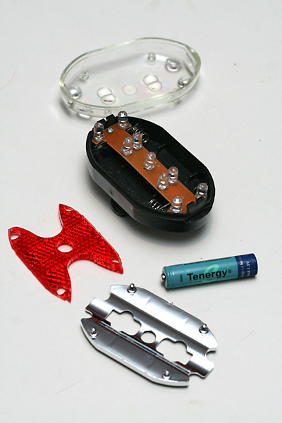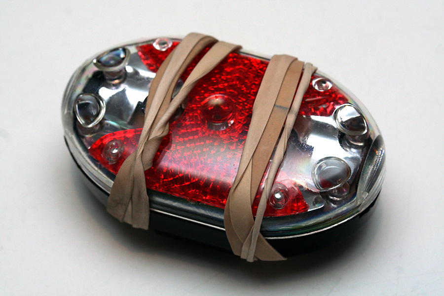 once i got back, i managed to get the light working again, but now i need rubberbands to keep it closed. this might be a good time to get a new rear light anyway (i'm thinking the planet bike superflash stealth). this one i picked up from dealextreme seems to fade in intensity every time i use it. it could just be the batteries, or maybe the cold temperature, but i rather have something that i can depend on.