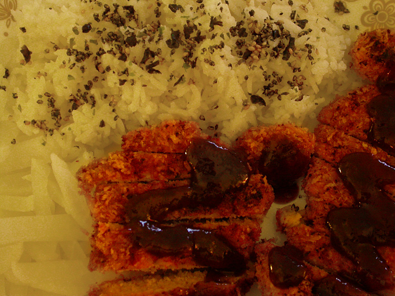 i had another pack of pork chops that i needed to eat before it went bad. unfortunately i forgot to defrost it so i ended up making some more tonkatsu with partially-frozen meat. it seemed to take longer to cook this time, so i might want try some high heat for the next occasion. the pork was definitely done, but a bit on the well done side since it was floating in the canola oil for so long.