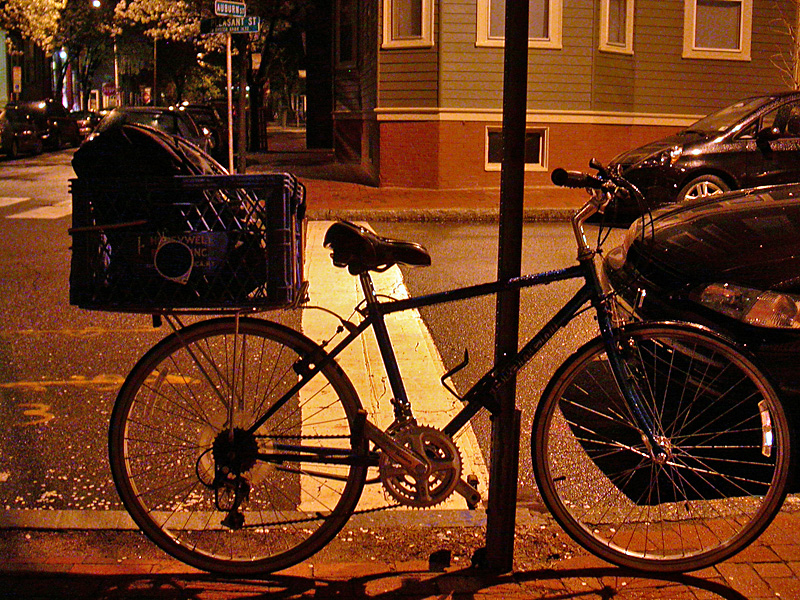 i still had the passive protection of my various reflectors, which apparently was enough. i also took small side streets whenever possible to further avoid any sort of car traffic. there was but the faintest drizzle as i pedaled home, nothing but darkness and the damp smell of flowering trees, especially the sweet scent of sycamores. it might've been cold (39°) had i not been bundled up in several layers including thermal underwears (the ones my aunt and uncle gave me for my birthday that i never tried on). i was actually disappointed that i got home so fast and briefly thought about extending my ride with a loop around harvard square, but it was getting late and i had already locked my bicycle.