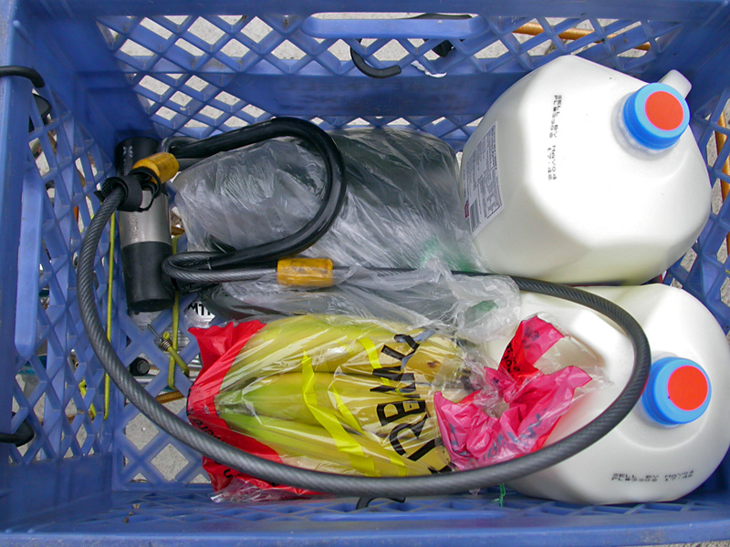 i went to market basket to pick up a few things for the cafe. i figured my milk crate could carry 2 gallons of milk, which is what i ended up buying.