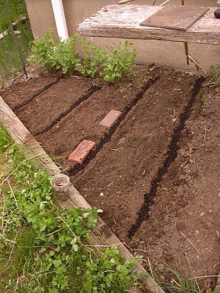 i tried growing them in my community garden plot last spring but had a few leggy seedlings at best. i'm hoping the sunnier condition of the belmont garden will be more successful. as a matter of fact, i'm using the leftover seeds from last season. later i cleared up another plot, this time on the southeastern side of the house next to the chinese chives and below the defunct satellite dish. here i planted 2 rows of mesclun.