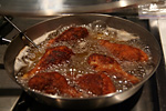 so i reduced the heat when i should've just left everything alone since the oil temperature was going to drop anyway from adding the cold chicken pieces. also the pan i was using didn't heat evenly. i'll definitely look into getting a 12" cast iron pan if i'm really serious about fried chicken (let's see how my heart and arteries feel in a few days). in the future, i may also want to try frying in shortening, which i hear enhances the flavor. the chicken was okay, but the flavoring is mostly in the skin, as the meat itself was rather bland. i also heard about marinating in buttermilk, which is another idea.