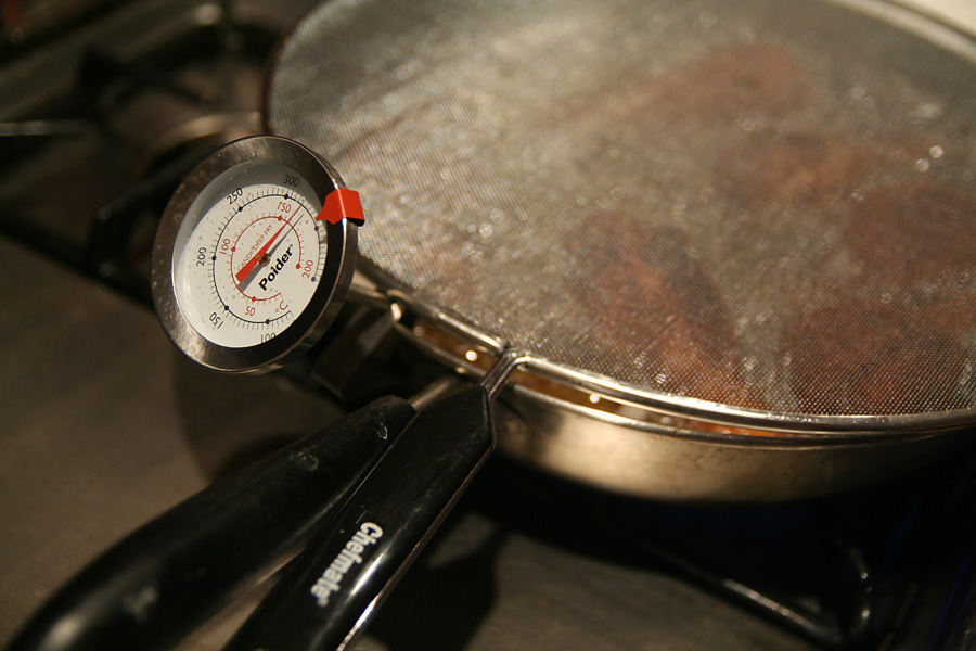 i went with a larger 12" pan this time. emptying a whole bottle of canola oil came up about an inch from the bottom. i'm not sure what kind of pan i was using, but it's the kind with a copper base. turns out it doesn't heat evenly, because my fry thermometer poking on the side of the pan read 300°F while using a stick thermometer measuring the center read above 350°F.