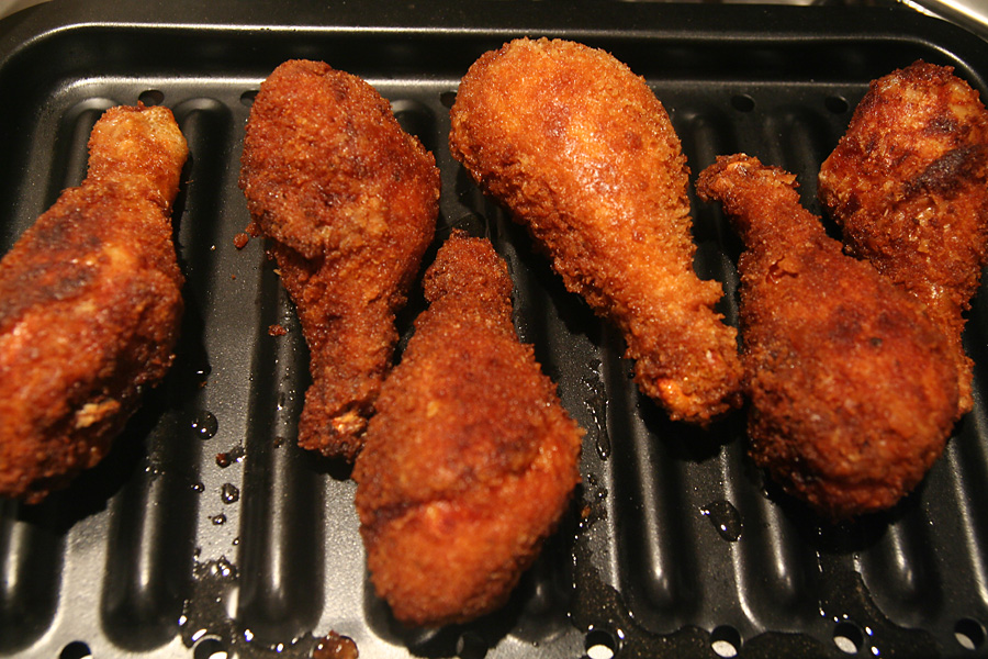 the drumsticks this time around weren't burnt like yesterday, but there was still a little bitterness on the crust. i think where i went wrong was probably frying at too low a temperature (the longer fry time overcooked the chicken), but i was afraid the oil would get too hot and get out of control,