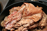 at 6:00 i finally removed the pork butts. unlike last time when the meat was dry, the pork this time was tender perfection; so tender that they crumbled as i spooned them out of the crock pot. as for the leftover broth, because of the high fat content, i couldn't just dump into the sink. my plan was to first pour it into a large pyrex bowl, wait until it condensed, then throw away the solids. unfortunately i had a hard time grasping the hot ceramic crock pot and i ended up slipping and pouring most of the liquid into the sink. this is not a good thing, i thought to myself.