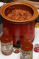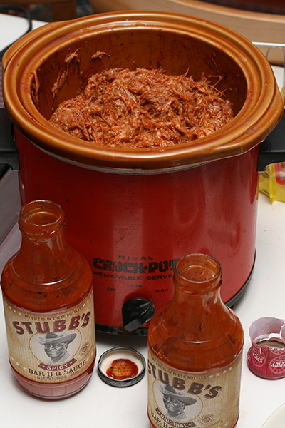 after shredding the pork (easy enough task since the meat was falling apart anyway), i put everything back into the crock pot and poured in the entire bottle of stubb's barbecue sauce. this was the sauce i used last time (except i had the spicy version instead). i actually prefer a sauce with more of a vinegary taste, but that picture of the black cowboy makes me want to buy it. i realized right away that 18 oz. of sauce wasn't enough.