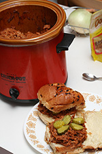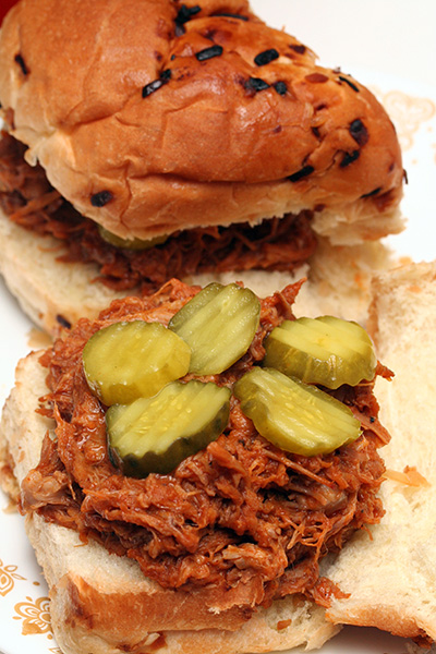 by 8:00 i was ready for my pulled pork on top of onion rolls sprinkled with pickle chips. this whole meal, from start to finish, took more than 9 hours to fully cook. i had two sandwiches but was already stuffed by the time i finished the first one. i have enough pulled pork now to last me an entire week (at least, provided i don't die from pork consumption overload).