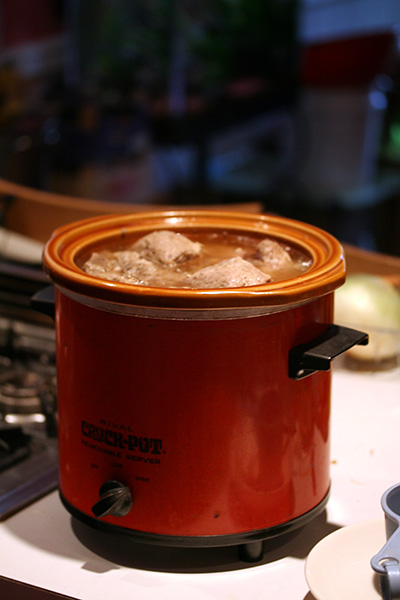 in order to make pulled pork i had to start the crock pot cooking early. i purchased about 6 lbs. worth of pork butt a few days ago. i chopped it into fist-sized pieces so they'd better fit in the pot. at the bottom i layered it with a whole chopped onion. one problem with my previous pulled pork was it was too dry. so this time i filled the pot with 2/3 water, then poured in some rice water for lagniappe. i sprinkled some sea salt, threw in a crushed piece of ginger, and added some chopped garlic. i set the crock pot on high and looked at the clock: the official start time was 11:00.