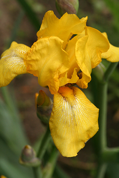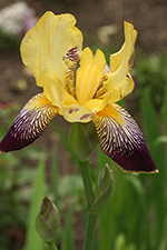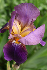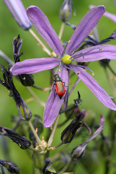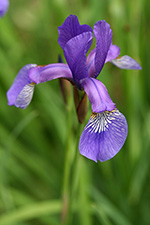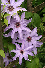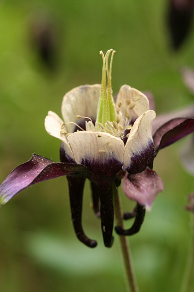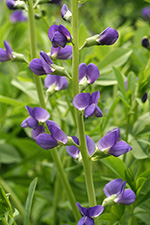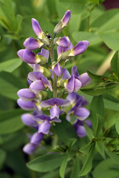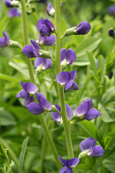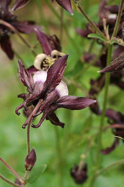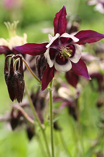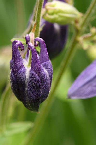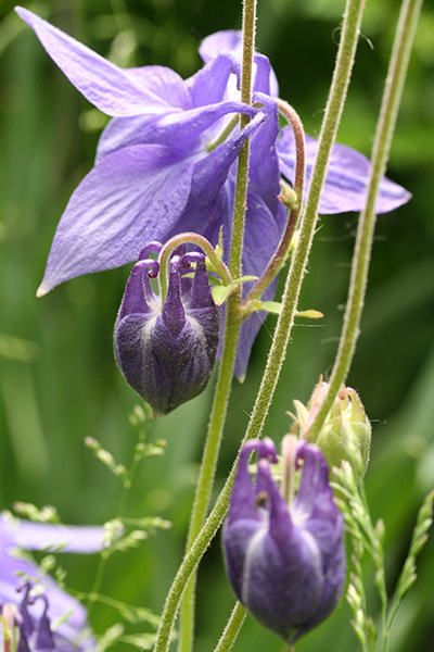 flowers in bloom include columbines, clematis, and lupines. there seems to be a profusion of purple/blue flowers growing in the garden.
