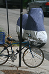 coming back, i made a pass at the community garden to water the plants. i added a dozen more morning glory seeds hoping at least a few will sprout. it didn't take long for whatever slug/snail/bug to have already eaten some holes in my basil leaves. i propped up some spreading raspberry stalks with some wooden poles. since the place was empty, i took advantage of the vacancy to take some more community garden photos. a couple of landscapers taking a break on the back of their pickup truck eyed me suspiciously.