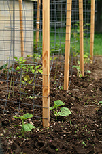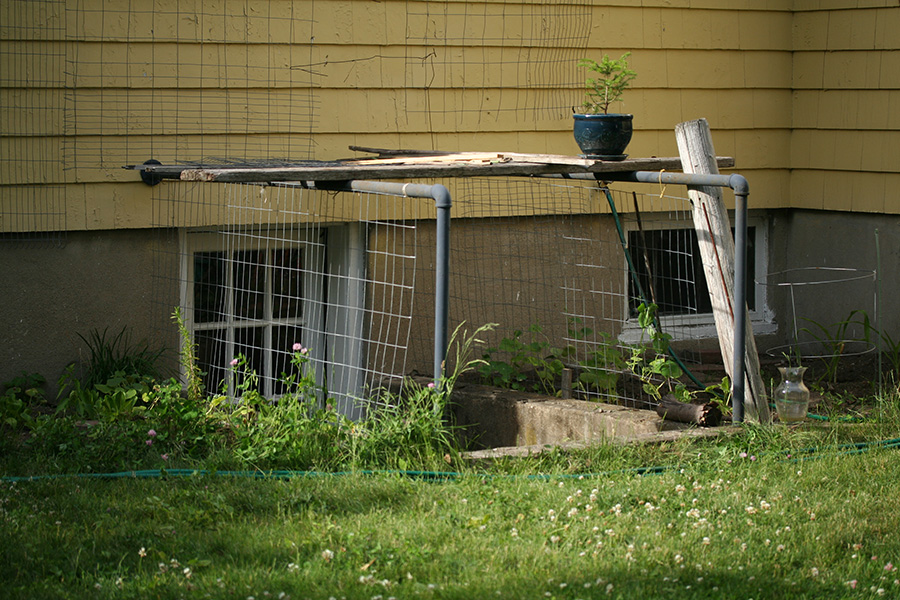 my father was the first to return home. he did some wisteria pruning then we put up some wire mesh trellises by the side of the basement entrance, for all the climbing plants (peas, gourds).