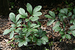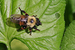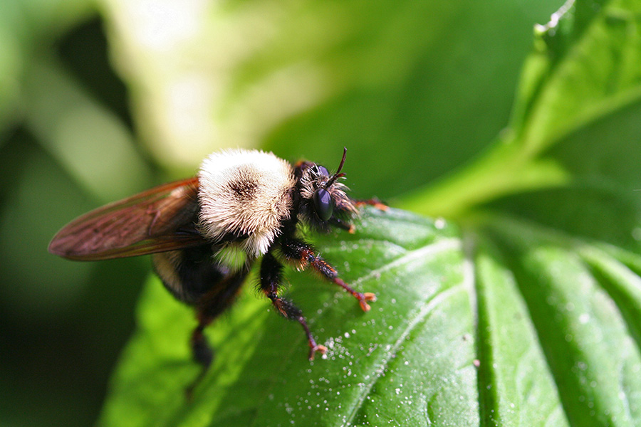 finally, observed a bee-mimic robberfly underneath the heavily-pruned maple tree. it was stalking prey, using the violet leaves as launching pads. it unsuccessfully attacked a fly, followed by a yellowjacket. the skirmish with the wasp was most impressive, and it seemed like maybe the fight was started by the yellowjacket itself. my father was there when i pointed out the robberfly. he initially thought it was just a bee.