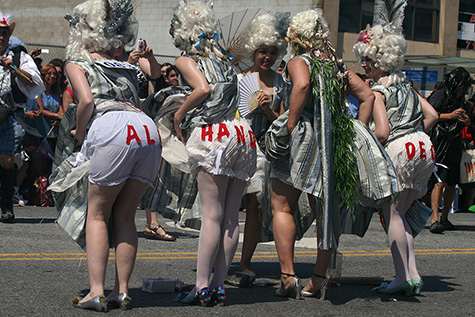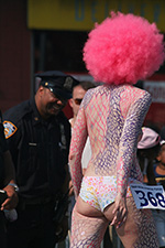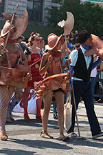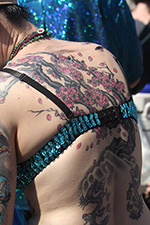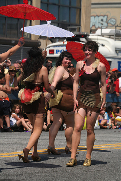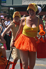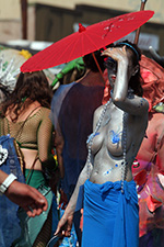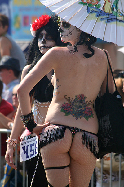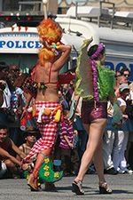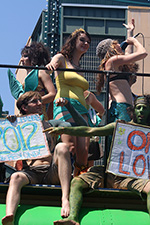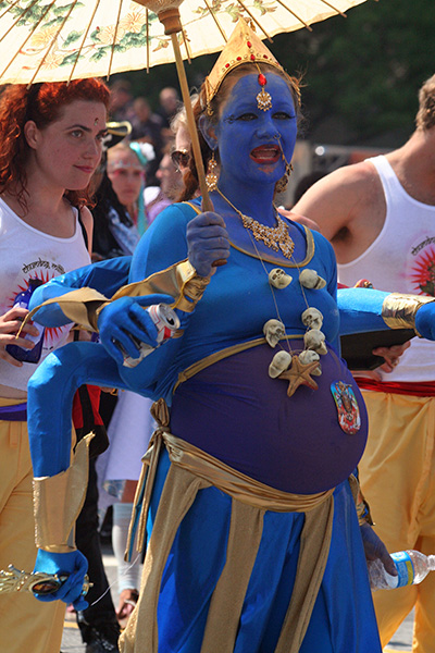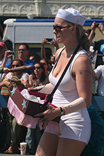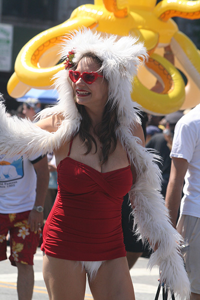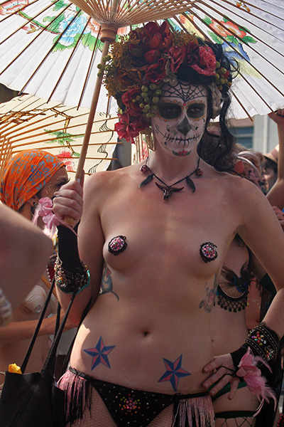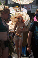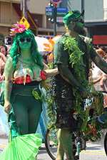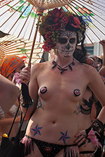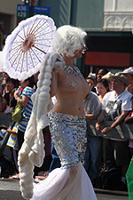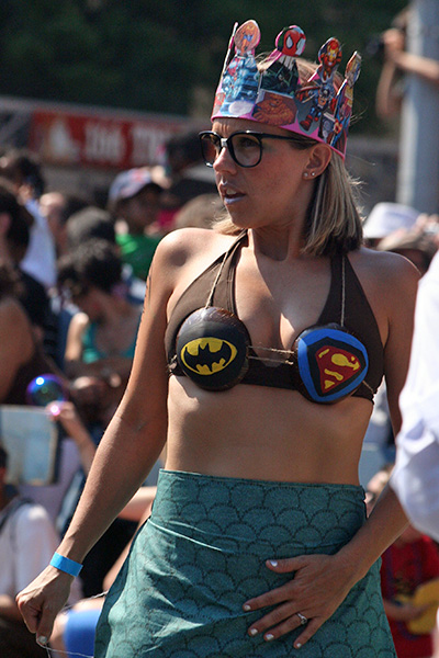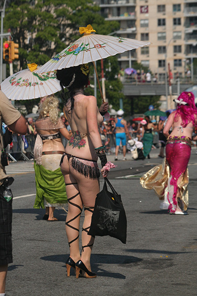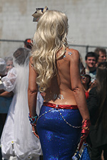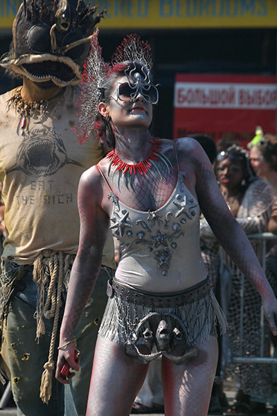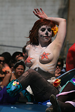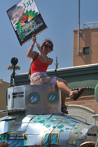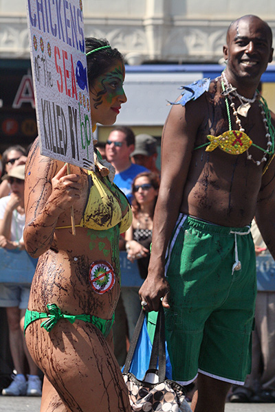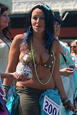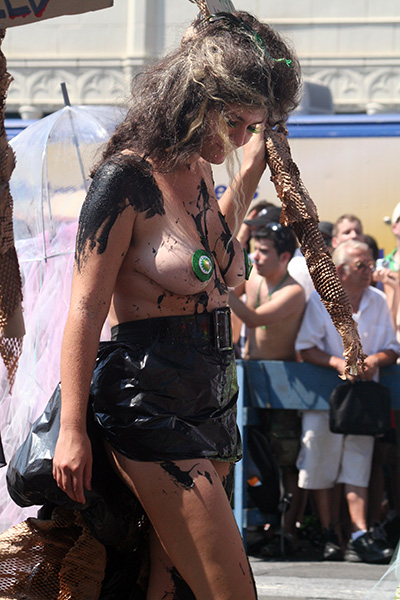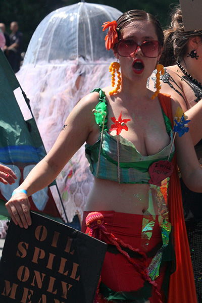 with a lot of people protesting BP because of the oil spill and the usual aquatic themes of the parade, and a typical costume would be to smear themselves with dirt. it also seemed more subdued somewhat, with the surprising lack of boobage a clear indicator (contrary to photographic evidence, which shows you how much more toplessness in a typical mermaid parade).