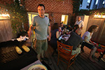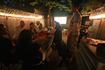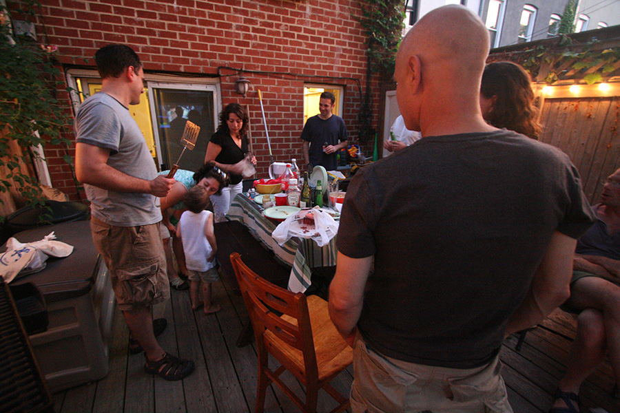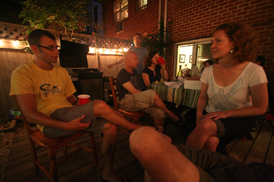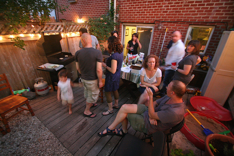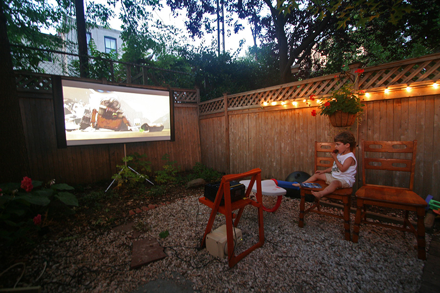 i helped john put up some lights in the backyard before the guests arrived. i had a hot dog, then later a burger. their neighbor jeremy brought along his little boy josh for will to play with. john set up the projector and played wall-e for the kids first, before the adults showed up.