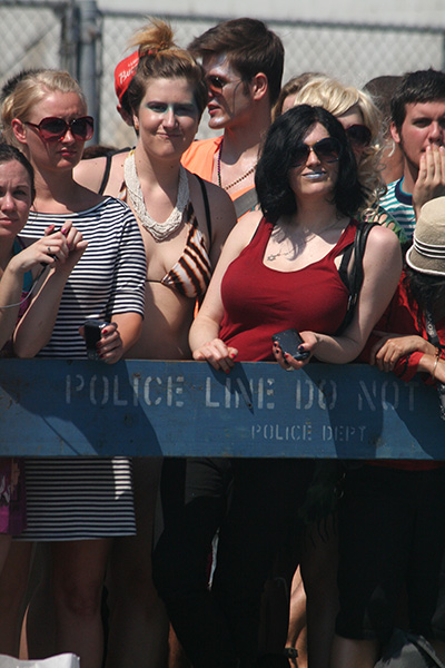 i think there's a public bathroom/changing room by the bench on the boardwalk). back outside, i parked myself behind the wooden barricade directly across the street from the subway station entrance. in years past this was the best place to be, since i could see all the mermaids arriving. however, this year, the MTA parked a pair of vans in front of the entrance, blocking my view.