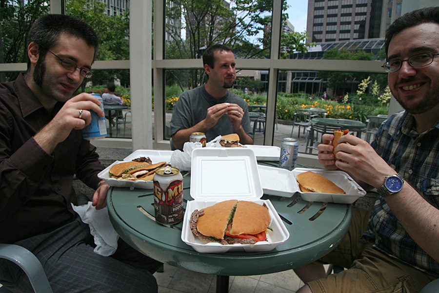 i figured we'd just eat in the office, where there seemed to be plenty of conference areas that could become makeshift lunch tables, but since they spend most of their time in the office, they naturally wanted to leave. we went downstairs into the prudential mall to a secret (so they said) glass window eating place with tables and chairs, right next to the prudential gardens. there we had lunch, along with complimentary canned sodas courtesy of their office snack bar.