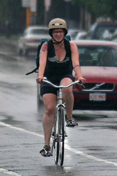the severe storms didn't arrive until after 5:00, when the sky suddenly darkened. even though, the downpour only lasted a few minutes, before it became a light drizzle, and then clearing up. i ran out to beacon street in the hopes of at least catching some commuting bicyclists getting caught in the rain. a lot of sandals too, which i think is a bad idea. i wore flip flops riding into harvard square, and i had a hard time reversing the crank arms because the metal teeth of the pedals would dig into the top of my feet.