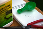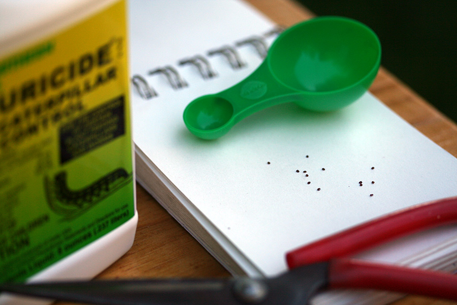 the liquid Bt has the color and consistency of a wheat grass shot you might find at a health food store. after some fancy math, i figured out how much Bt i needed to mix with water for my hand-held spray bottle (had i known it was a pint, it would've saved me some calculations) - half a teaspoon, or 2 scoops from the small end of my miracle-gro measuring spoon. i ended up spraying two bottles worth of Bt solution. it probably won't do anything to prevent the SVB from hatching, but can't hurt to try. it's also fun waging biological warfare in the garden on a micro scale. maybe i'll hatch the eggs i've collected then run various natural pesticide experiments on them. am i a monster? probably.