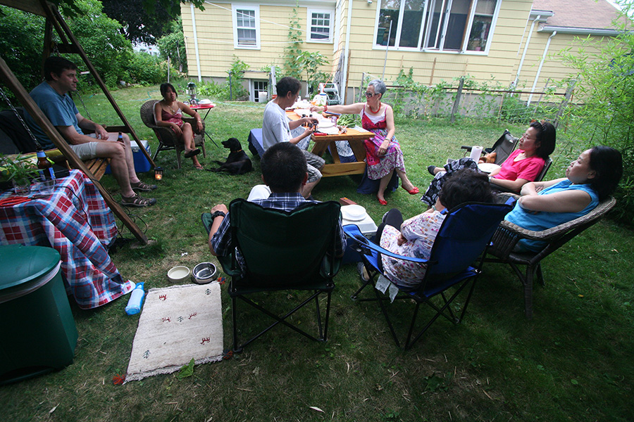 despite the july heat, it was actually pretty cool under the shade of the backyard maple tree with the slight breeze. in fact, it was more comfortable outside than it was inside. we stayed outside well past sunset, lighting citronella candles to chase off the mosquitoes. i put a headlamp around hailey's neck so we could spot the black dog in the night. my 2nd aunt and uncle were the first to leave, my father driving them back to cambridge. next was my godmother, followed by matthew and lili.