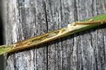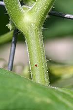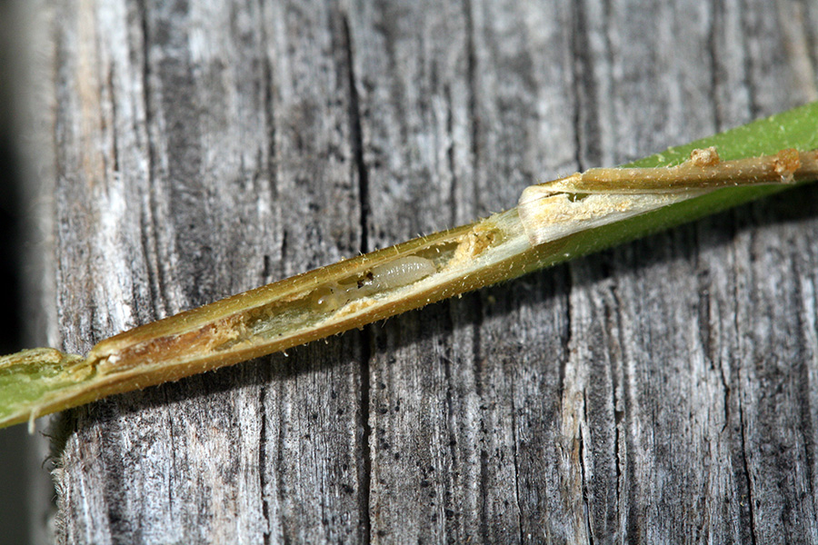 having said that, the boring has already begun. i found my first squash vine borer worm inside the petiole of a squash leaf. reports of borers attacking the base of the squash stems don't seem to match my observations (although to be fair not all the eggs have hatched yet). i've found eggs everywhere but the base, and they don't seem to be too picky as to where they tunnel into the stems. i first noticed the leaf, which was yellow (although not droopy). further inspection revealed a hole on the stem. after snipping off the leaf, i sliced open the stem to reveal a small worm inside.