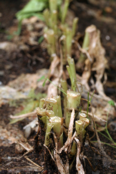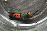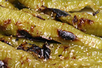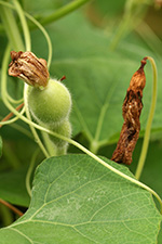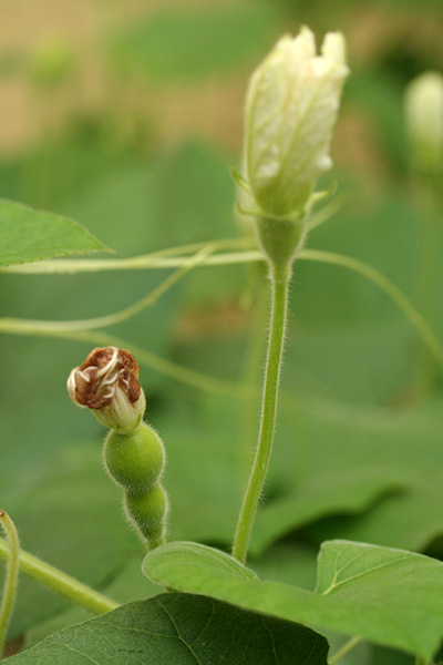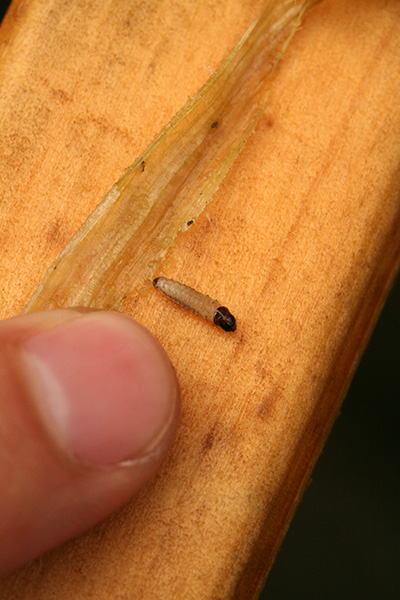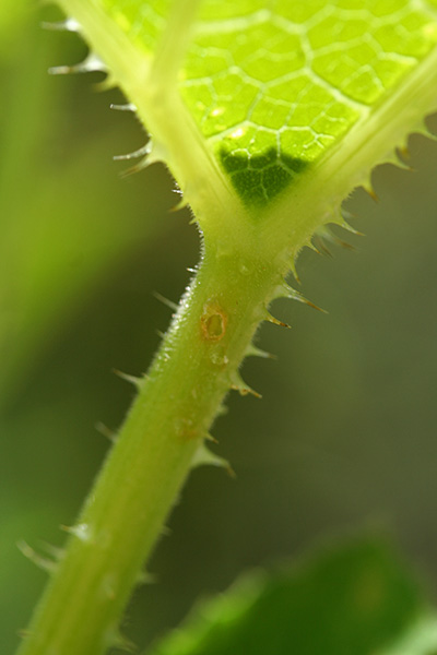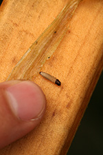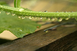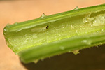 a glimpse of another squash vine borer (SVB) hanging out in the garden drove me to action. instead of hovering by the squashes, it was hiding amongst the cucumbers when i finally caught it in a jar. if i wasn't growing squashes i would normally leave the SVB's alone because they're just the prettiest looking moths: metallic greenish blue body, clear wings, with hairy orange legs and orange banded abdomen with black spots. i found a few more eggs which i knocked off with a knife, but it may already be too late, since i found 3 infected leaves. the sign is so subtle normally you might not even notice, but i spotted small holes on the stems at the base of the squash leaves. slicing open the crunchy hollow stems revealed small borer worms inside. i'm still not quite sure about their life cycle. some sources online saying they bore into the base of the plants themselves, but all the ones i've found have been on leaf stems, which are easier to take care of because i can just prune off the leaves. if they actually did get to the base of the plants, that'd be more serious.