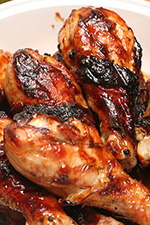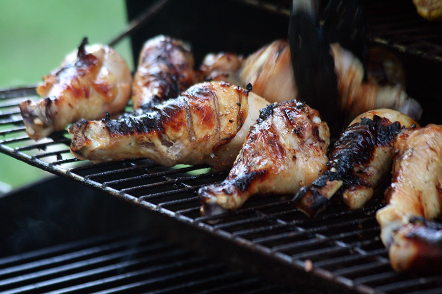 it took approximately 45 minutes to cook 18 drumsticks on low-medium propane barbecue heat. earlier my father marinated the chicken with some salt, garlic, hot sauce,