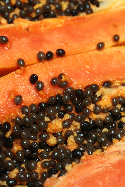 i had some cereal for breakfast, some stale generic brand fruit loops (i originally bought it because of the colors). for lunch, a yogurt and a few nectarines throughout the day as a snack. for dinner, cold leftover barbecued chicken and an ear of corn. for dessert, half a large ripe papaya. i'm not actually a fan of papaya. it has a musky taste, sort of reminds me of coffee for some strange reason. it also has an awful smell reminiscent of dog poo. but apparently it's very healthy and makes a good photo subject, the edible seeds resembling balls of caviar.