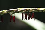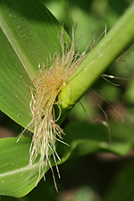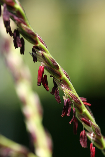 the red corns have started to tasselate and it won't be long before a cascade of corn pollen lands on the silk strands down below. sweet red corn tassels are very distinctive because they're red, like the kernels they'll one day hopefully form.