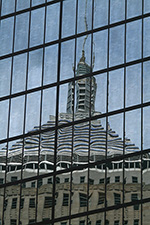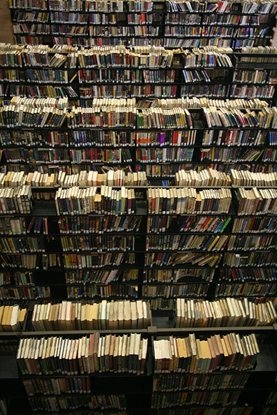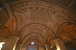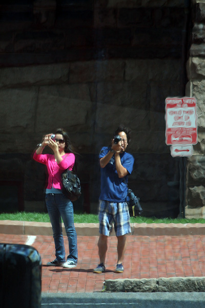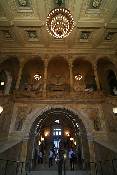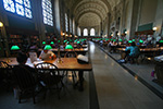 after walking down the length of newbury street (admiring both the name brand boutiques and the empty for-lease store fronts) to copley square, we checked out the boston public library. susan was impressed by the architecture, but was floored by the stacks of books, especially the large collection of chinese literature. she noticed a few titles banned in china and took some photos to show friends back home. she also couldn't believe people could borrow movies and music from the AV department. we used their public bathroom, looked through the exhibit of vintage travel posters, then finally left the library.