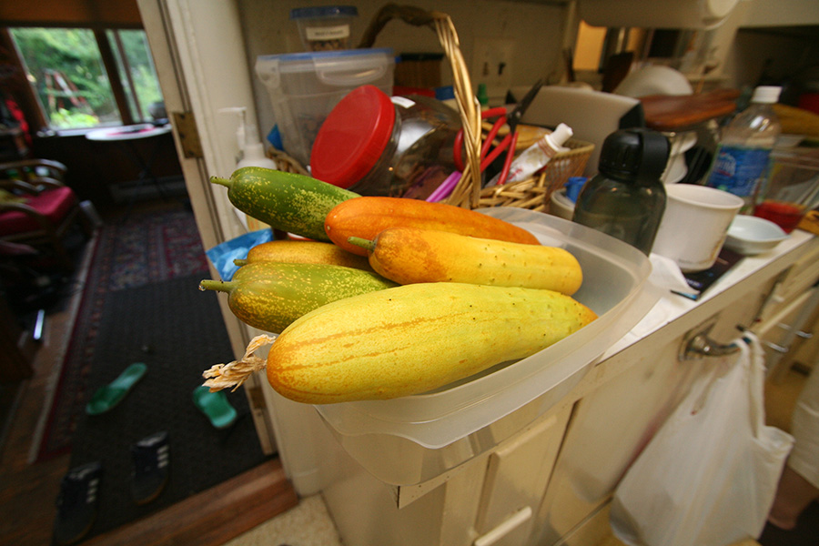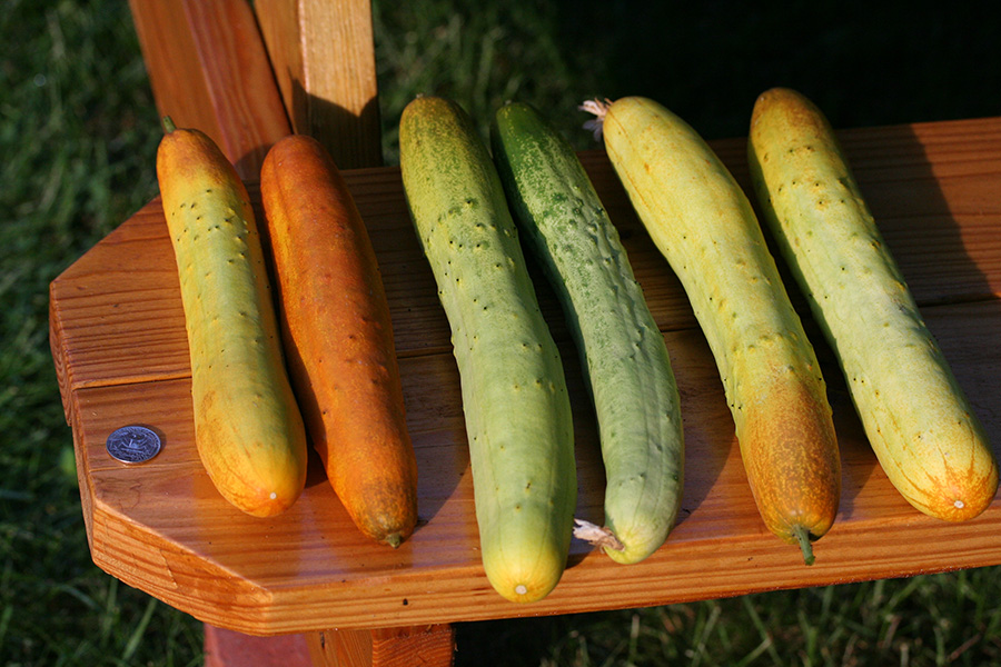 the chinese word for cucumber is, "yellow melon," which is unusual because cucumbers are normally green, at least the ones we see in grocery stores. these korean cucumbers might shed some light on the chinese etymology, since they turn orange-yellow when they're ripe. these cucumbers are prodigious producers despite poor soil conditions. they also seem resistant to the powdery mildew that has affected the nearby maple tree and all the squash and gourd plants.